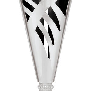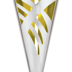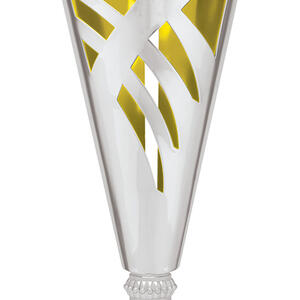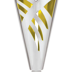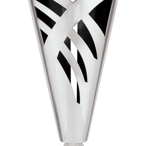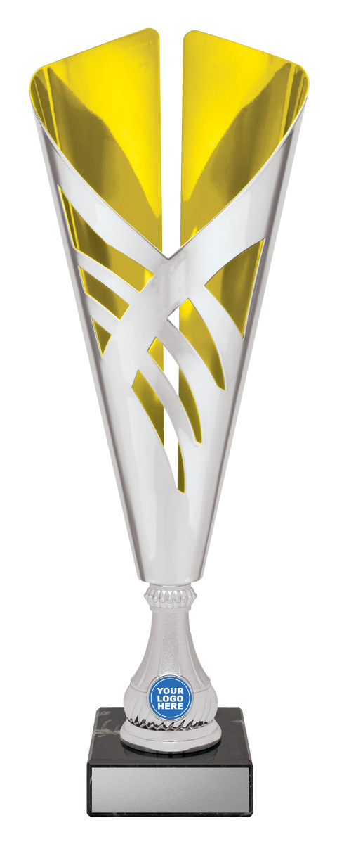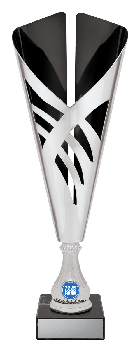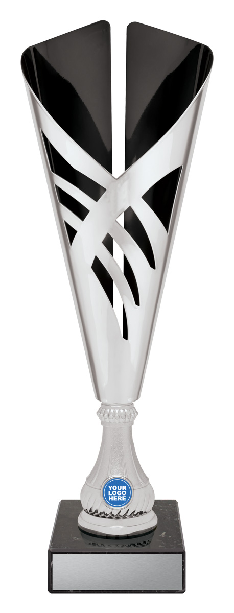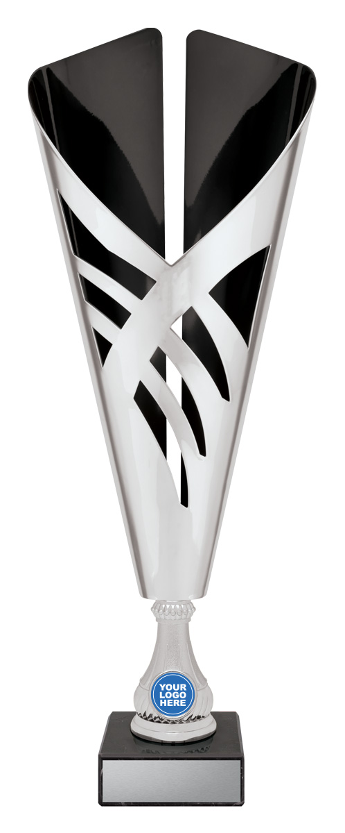This metal trophy cup offers a contemporary take on classic recognition, available in elegant silver and gold or silver with black finishes these cups display a distinctive conical silhouette and cut out patterns. Crafted from durable metal and plastic and set on a solid marble base, it is designed to impress at any ceremony. The customisable logo area ensures each award is both memorable and uniquely professional.