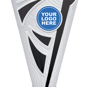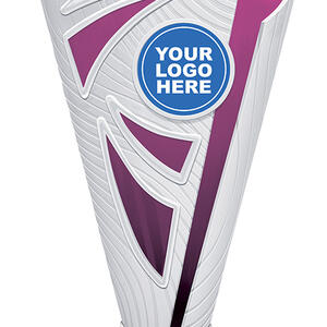 This contemporary plastic trophy cup blends silver tones with striking blue, black, purple, or pink highlights. A dynamic star and abstract cutout design, complemented by a black base adorned with a silver star pattern, creates a memorable and elegant award. Featuring a customisable logo area, it is crafted for reliable recognition across a range of achievements.