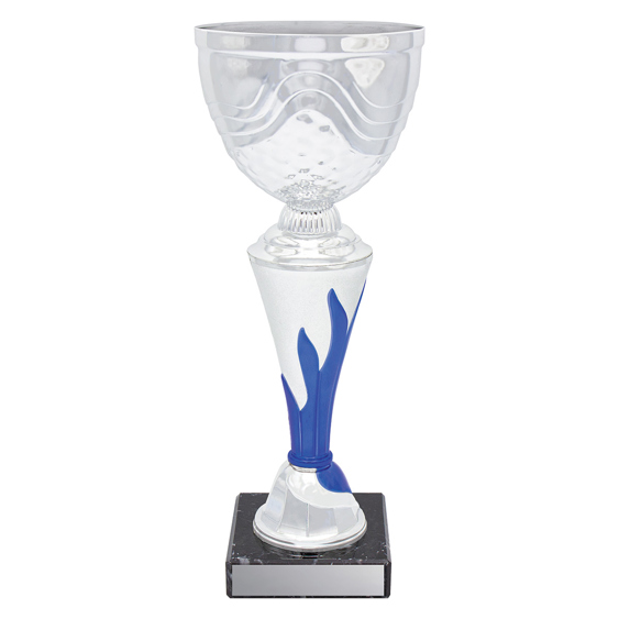 The Blue Flame Cup is a striking metal trophy cup, designed to honour achievement across any sport or event. Crafted from quality metal, plastic and marble, it features a bold silver, blue, and black palette. The wave pattern on the cup and flame like conical base create an elegant, contemporary silhouette, making it a memorable award for standout performances.