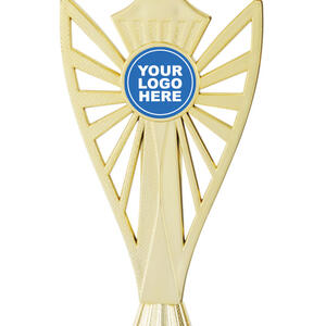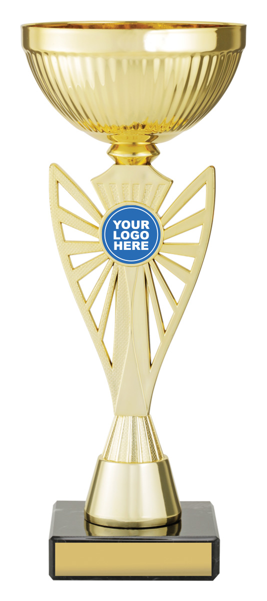 This gold trophy cup pairs a classic round cup with a contemporary black marble base, creating a refined and memorable recognition piece. Expertly crafted from metal and plastic, it features a customisable logo area for a personal touch. The elegant design suits general sports achievement and offers lasting quality for any celebratory occasion.
