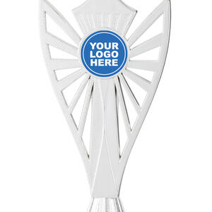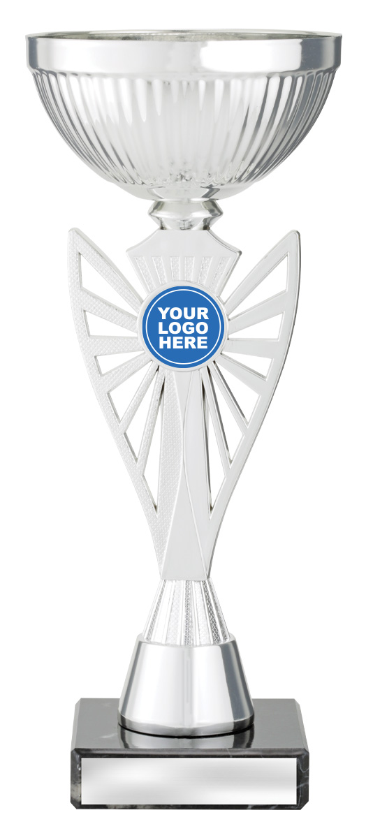 This silver trophy cup features a refined bowl shaped top, a decorative black base, and a customisable logo area for unique recognition. Crafted from quality metal, plastic, and marble, it offers a balanced blend of durability and elegance. Its timeless design makes it a trusted option for celebrating achievement across a range of events and organisations.