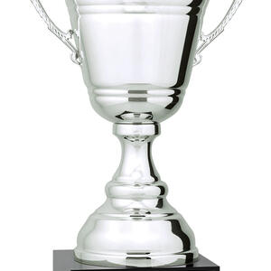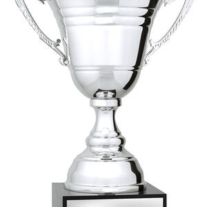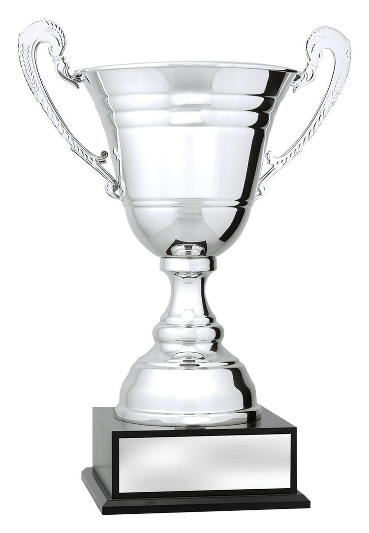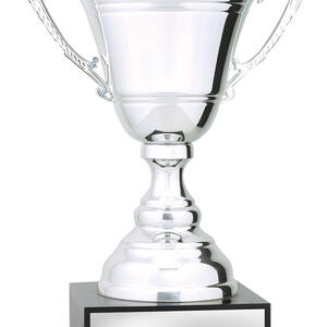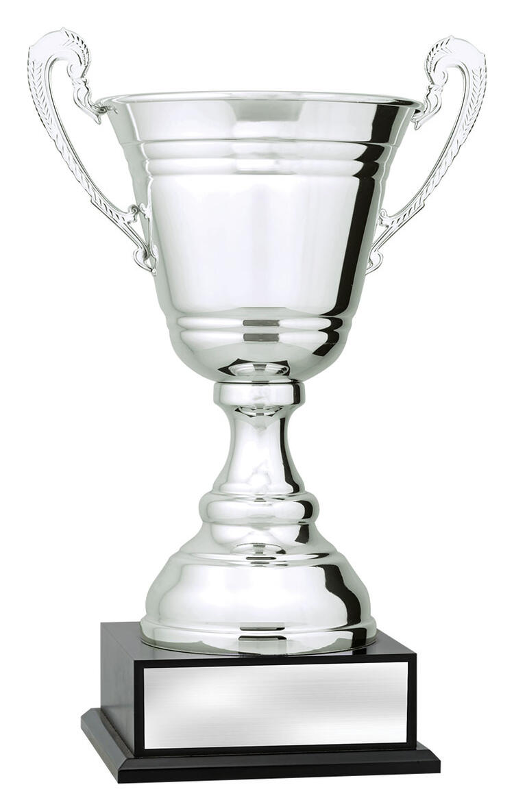 This classic metal trophy cup showcases a polished silver finish with contrasting black details, embodying both elegance and enduring quality. The traditional bowl shape with handles and a reflective surface creates a timeless symbol of achievement, suitable for a variety of sports. Set on a sturdy rectangular base, it offers a professional presentation for any recognition moment.