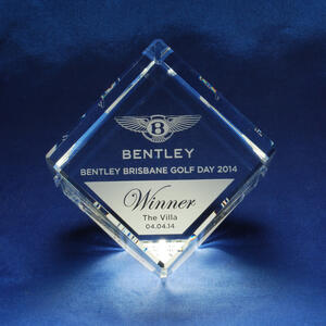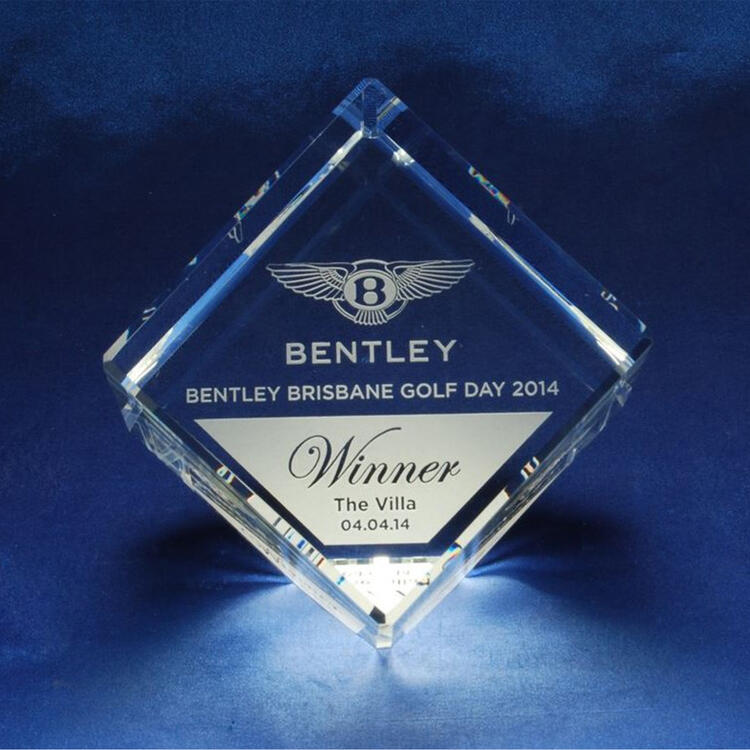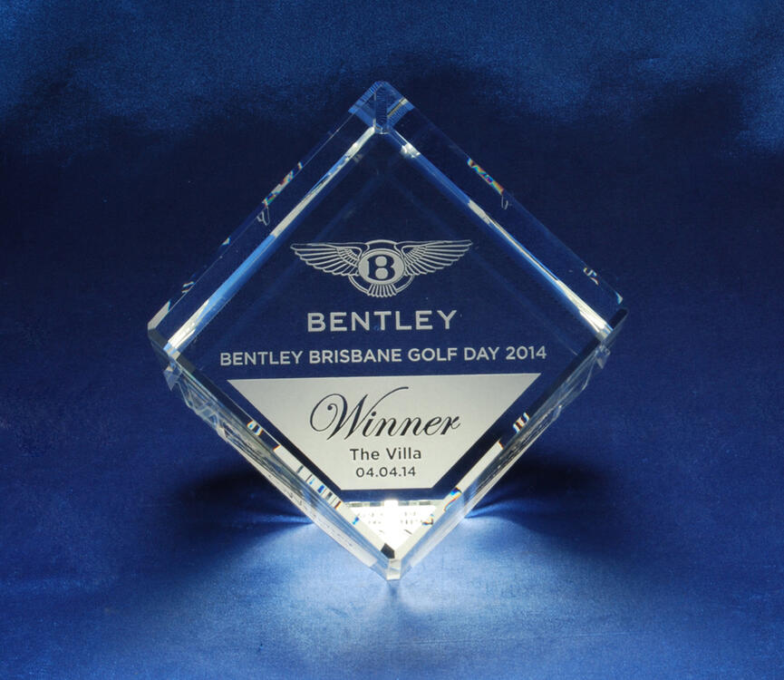 This crystal award features a contemporary cube design, masterfully crafted from optical crystal. Bevelled edges on every side catch and refract light, creating a captivating visual effect.