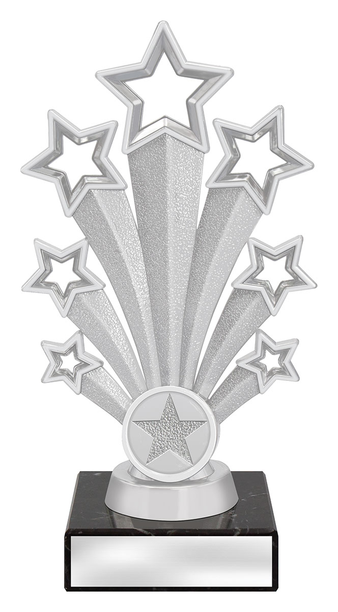 Inspired by the spirit of achievement, this silver trophy features a dynamic starburst design that commands attention. Crafted from plastic, it showcases a fan like arrangement of stars and a prominent circular base with an elegant star emblem. A refined choice for dance recognition or general award trophies, it celebrates dedication with quality and style.