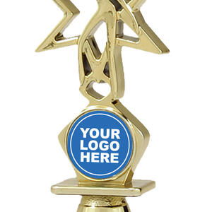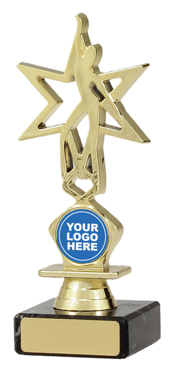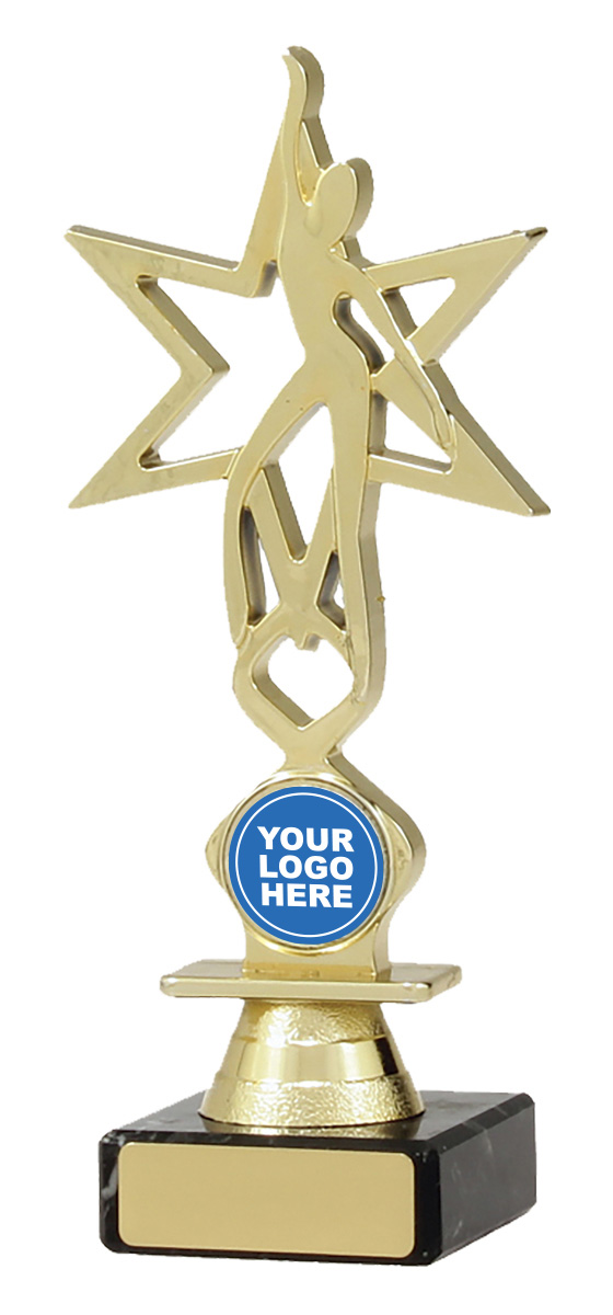 Celebrate achievement in style with this dance trophy, crafted with a striking gold finish. The elegant star and dancer figure design stands proudly atop a solid marble base, offering a premium and durable feel. A 25mm customisable centre allows you to showcase your organisation's logo or special message, making each award truly memorable.