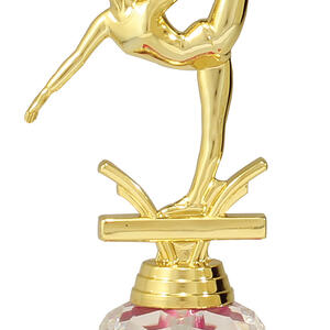 This dance trophy features a poised dancer figurine, mounted gracefully on a vibrant pink base with a diamond shaped clear component. The combination of gold, pink, and clear tones creates an elegant and celebratory appearance. Crafted from quality plastic, it offers a professional and memorable way to recognise achievement in dance.