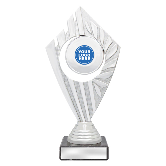 A contemporary silver trophy featuring a modern geometric pattern and round centre area for your custom logo. Mounted on a black marble base, this piece is perfect for a wide range of sports and achievement awards. Includes engraving plate.