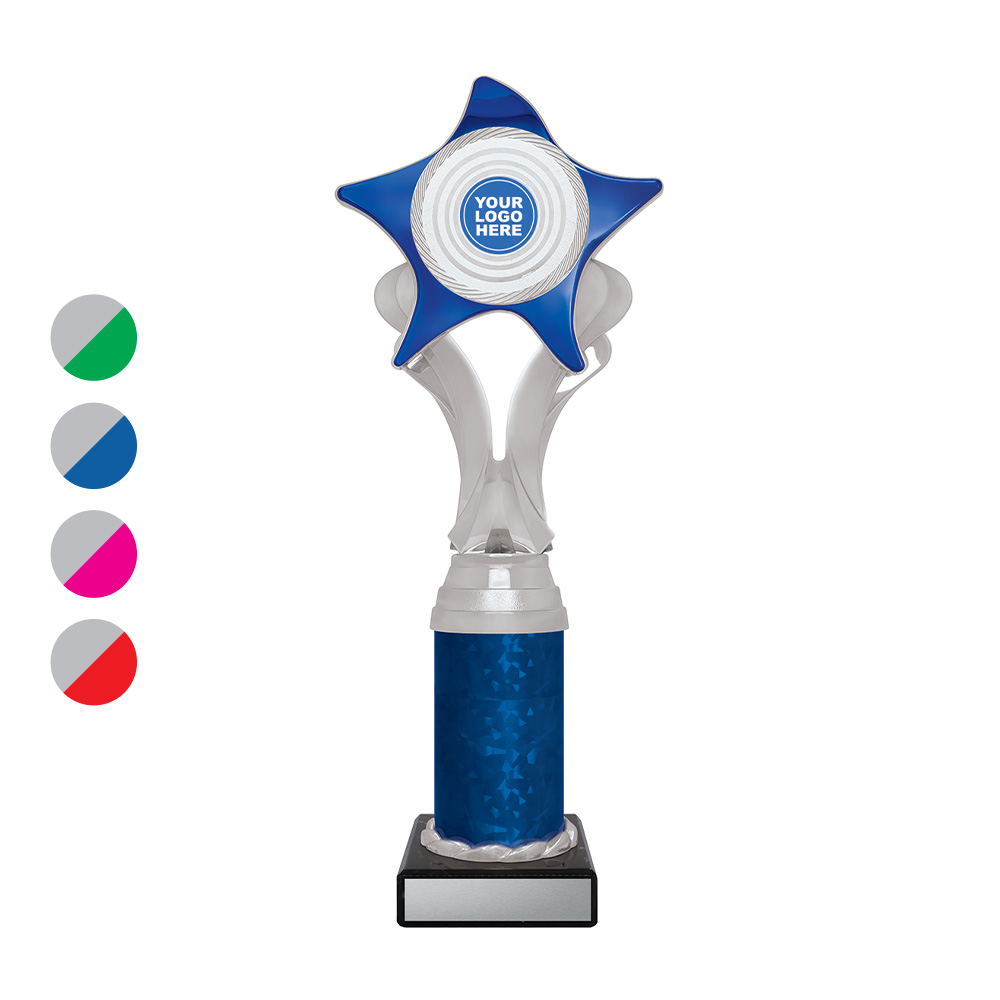 Crafted for moments of achievement, this dance trophy from the Athena Series features a striking star shaped top accentuated by your choice of vibrant silver and blue, green, red, or pink highlights. The sleek cylindrical design is made from quality plastic with a dedicated centre for customisation, this award offers a memorable and professional way to celebrate success in dance.