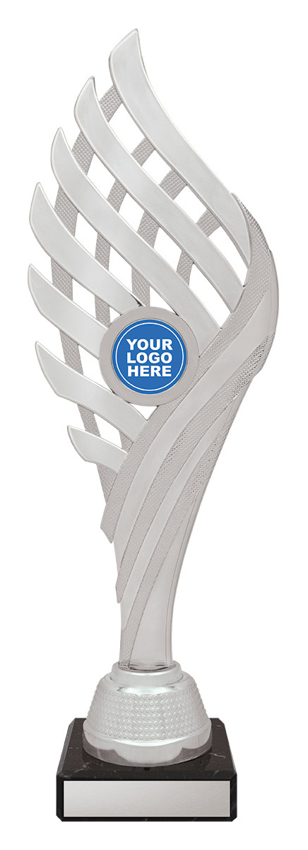 This dance trophy from the Skyway Series combines a bold wing like form with a sleek silver and blue finish for a modern, striking look. Crafted from durable plastic, it features a customisable 25mm centre for a logo or emblem, and rests on a stable black base. An elegant choice for recognising achievement in any dance event.