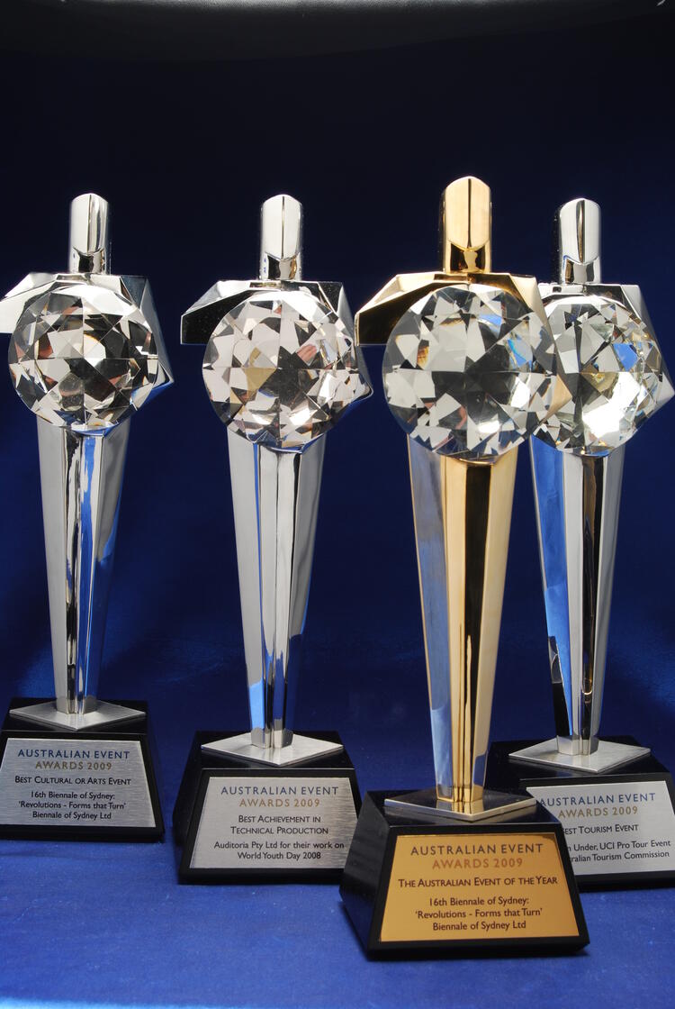 These prestigious custom designed awards feature a stunning fusion of metal and crystal, crafted to symbolise excellence and achievement in the Australian events industry. Each trophy is engineered with a solid metal body in gold or silver finish, paired with a precision cut optical crystal sphere that refracts light with brilliance and depth.