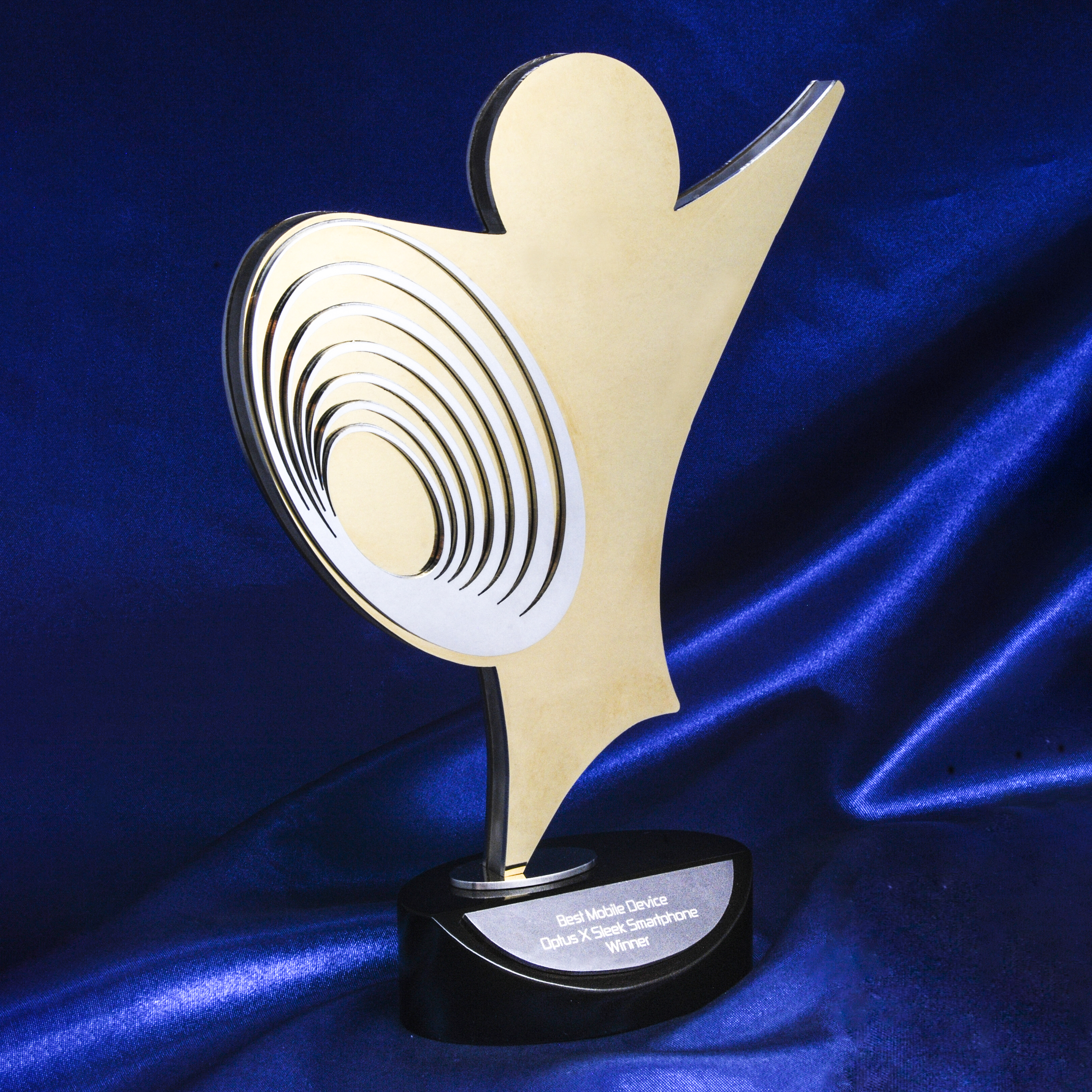The figure is securely mounted on a high gloss black timber base, complementing the metallic sheen with a touch of refined warmth. Designed to embody innovation and excellence, this custom creation delivers a bold, professional statement for any premium awards presentation.