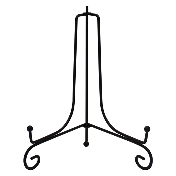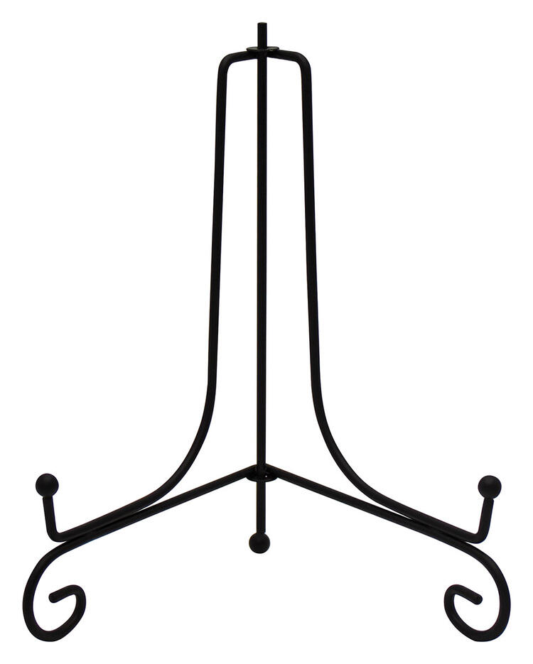 This metal black easel holder features a sleek, triangular silhouette with a gracefully curved base and decorative curled ends. Crafted from durable metal, it serves as a reliable and elegant stand for plates in any professional or celebratory setting. The classic black finish adds a touch of sophistication, making it ideal for both display and presentation purposes.