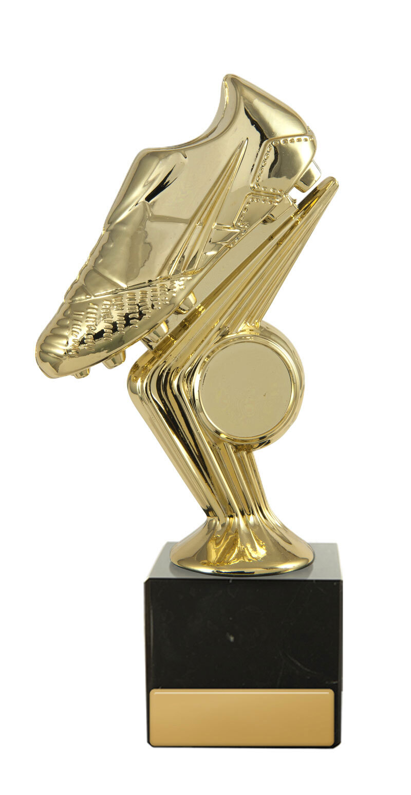 Showcasing a gleaming gold football boot poised confidently on a sleek black marble column, this football trophy embodies sporting achievement with a refined finish. Its durable construction and classic boot trophy design make it a standout piece for awarding players and teams.