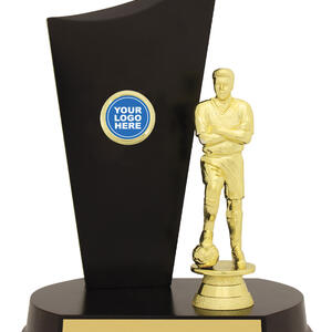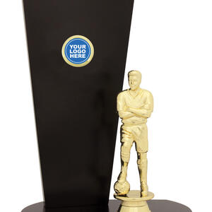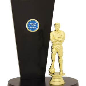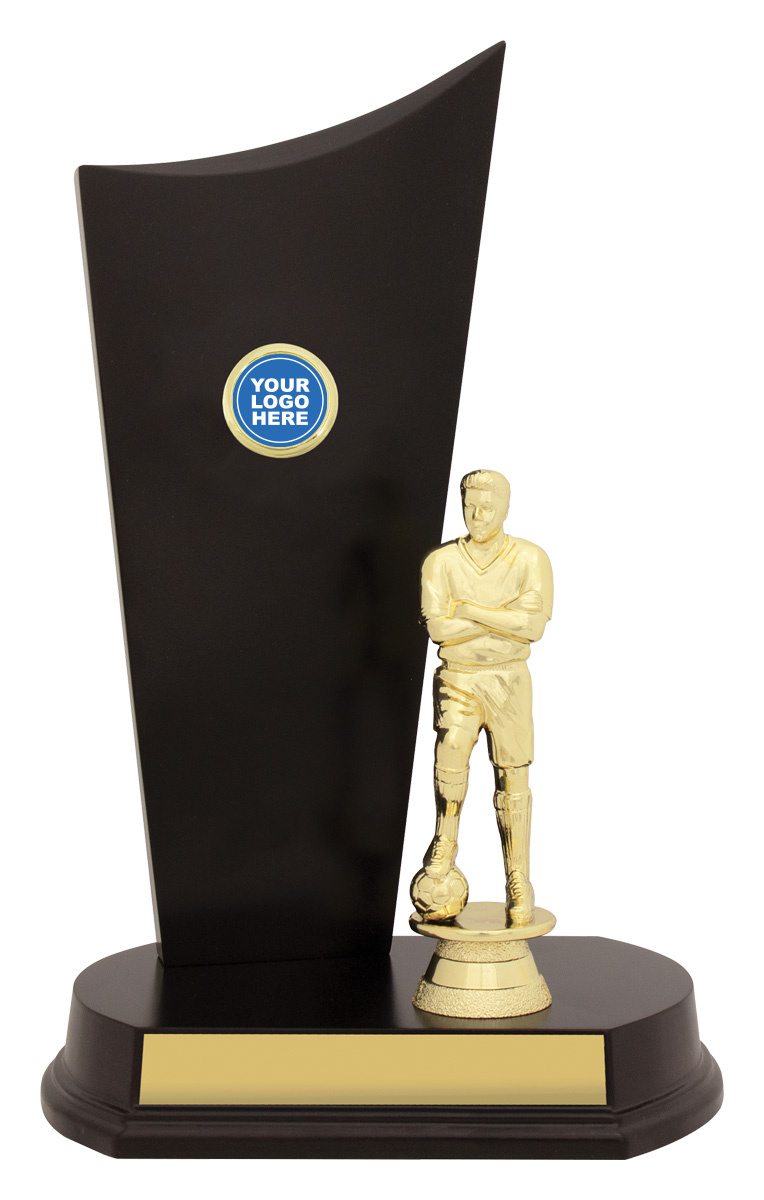 A contemporary choice among football trophies, this award features an elegant black timber design with a striking gold football player figurine. The asymmetrical crest shape on a rectangular base creates a dynamic profile, celebrating skill and dedication on the field. A dedicated 25mm centre allows for a custom logo, making it a memorable recognition piece.