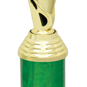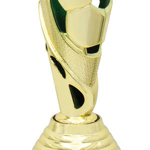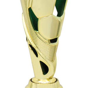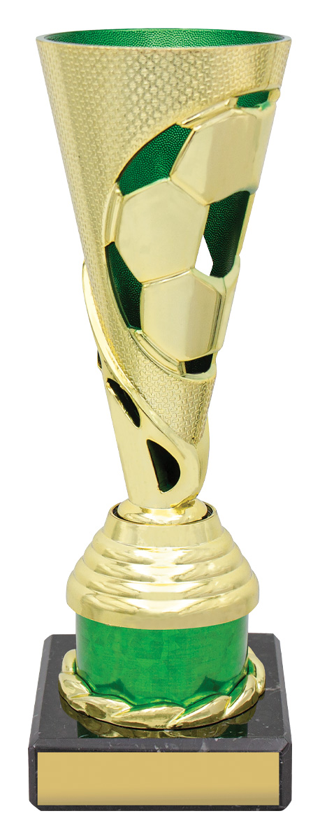 This contemporary trophy celebrates football achievement with a striking gold and green conical design. The hexagonal pattern and integrated football motif capture the spirit of the game, while the black marble base provides a refined foundation. This piece stands out among football trophies as a reliable and elegant choice for recognising success on the field.