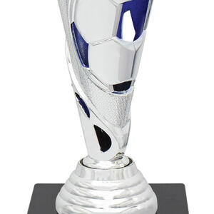 This contemporary trophy is crafted in a striking conical design, finished in elegant silver and blue with black accents. A dynamic football motif is integrated into the structure, complemented by a dedicated 25mm centre perfect for a custom logo or emblem, it's a lasting symbol of achievement in football trophies.