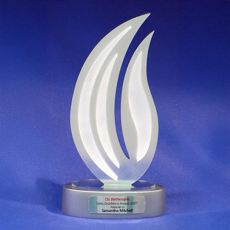 Elegant and contemporary, this custom acrylic trophy features a stylised flame design crafted from frosted acrylic. The layered structure captures and diffuses light beautifully, symbolising inspiration and achievement.