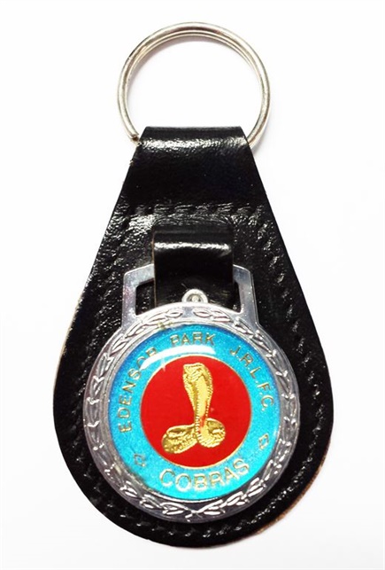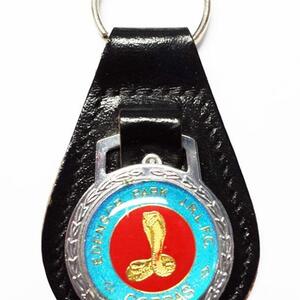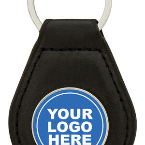 A stylish teardrop shaped key ring made from soft black leatherette with contrast stitching. The round metal insert allows for a full colour printed logo, making it a professional and durable promotional accessory.