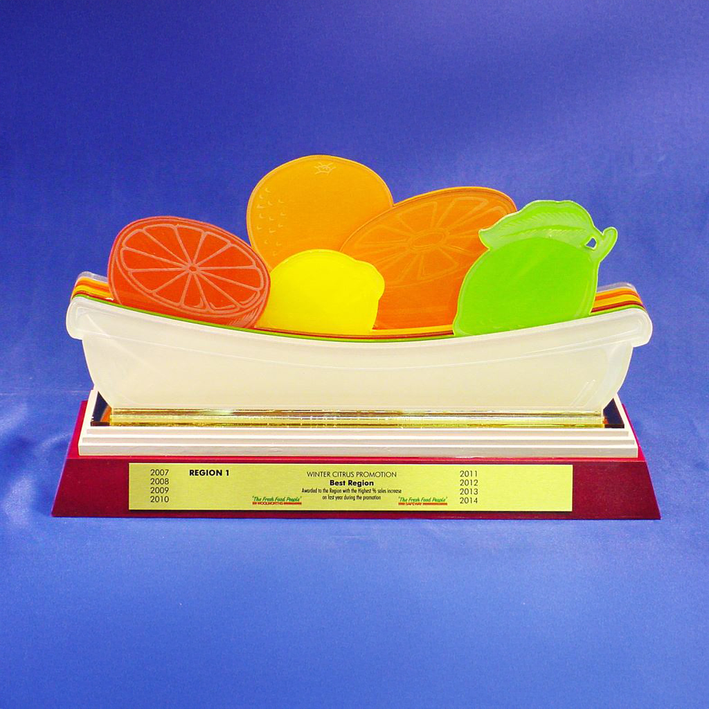 A vibrant and creative acrylic trophy designed in the shape of a fruit bowl, featuring layered and coloured acrylic fruit pieces. Each element is precision cut and assembled for a three-dimensional effect, mounted on a polished timber base with engraved plate.
