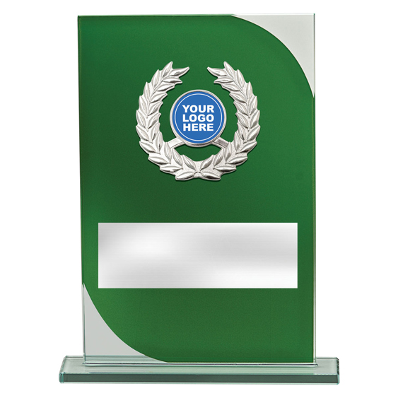 With a contemporary green and silver design, this glass plaque features a laurel wreath emblem and customisable insert. Suitable for any sport, school, or corporate presentation.