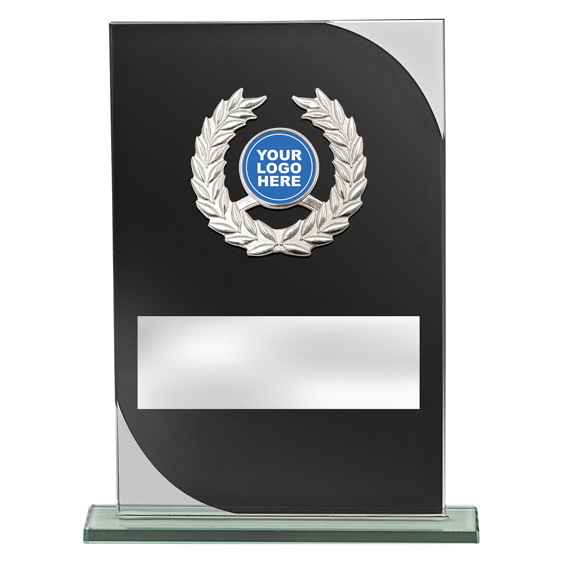 This sleek black and silver glass plaque features a silver laurel wreath emblem and curved corner detail. The circular insert area can display your custom logo or a standard sport centre for a professional finish.
