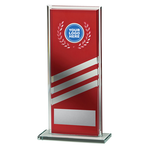 Featuring a bold red and silver colour combination, this glass plaque includes a laurel emblem and insert area for your logo or sport image. Elegant and modern for any presentation.