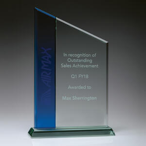 Glass trophies typically have a very slight green tinge, which can subtly affect the appearance of colour printing. In contrast, crystal trophies are completely clear.