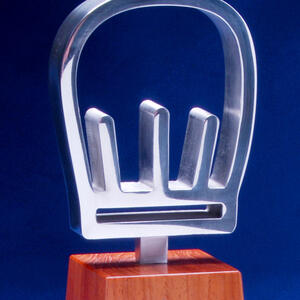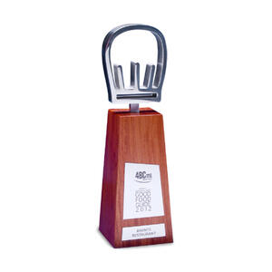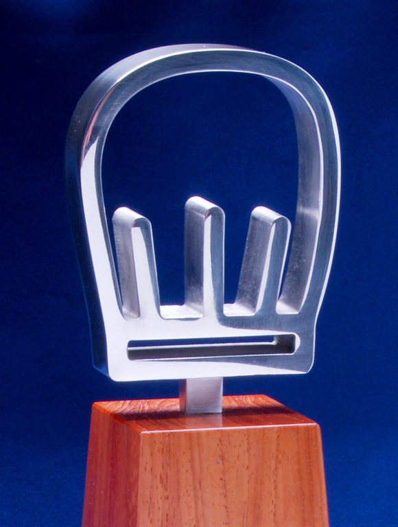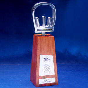 This custom award combines the warmth of natural timber with the sleek sophistication of solid polished metal. Designed for the Good Food Guide, the piece celebrates excellence in dining with a clean, contemporary aesthetic that reflects both craftsmanship and creativity. The polished metal cut out symbol is mounted atop a precisely shaped timber base, producing a visually striking contrast between organic texture and refined finish.
