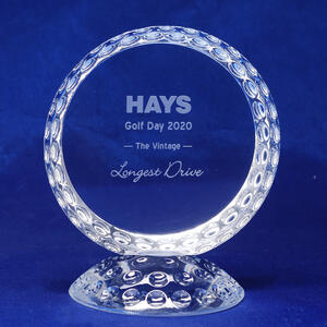 A distinctive crystal golf award with dimpled texture replicating a golf ball, complete with matching crystal base. This elegant piece makes a standout trophy for tournaments, club events or corporate golf presentations.