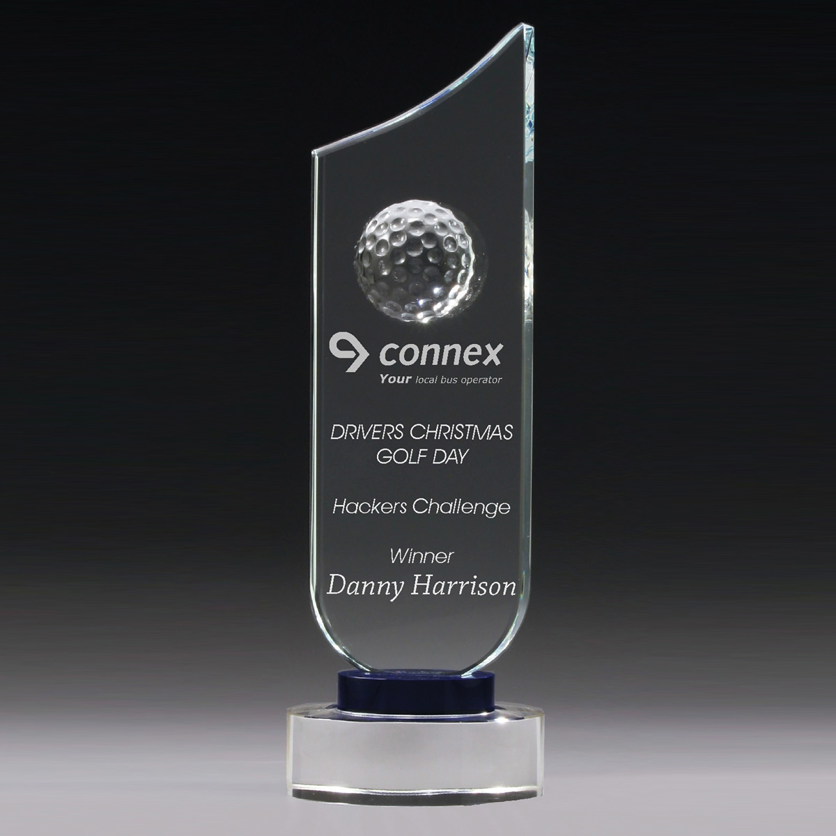 A contemporary crystal golf award featuring a raised 3D golf ball detail. Mounted on a black crystal base, this striking piece is perfect for championship winners or premium golf day prizes.