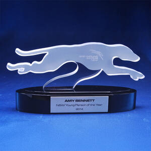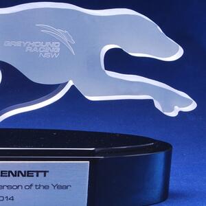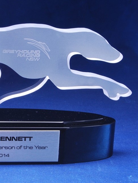 Custom frosted crystal award in the shape of a racing greyhound, mounted on a glossy black base.