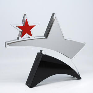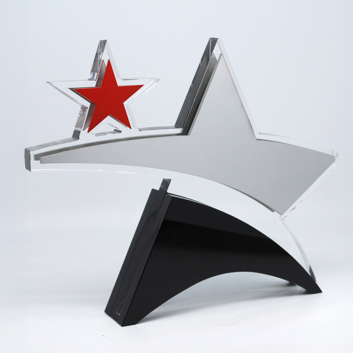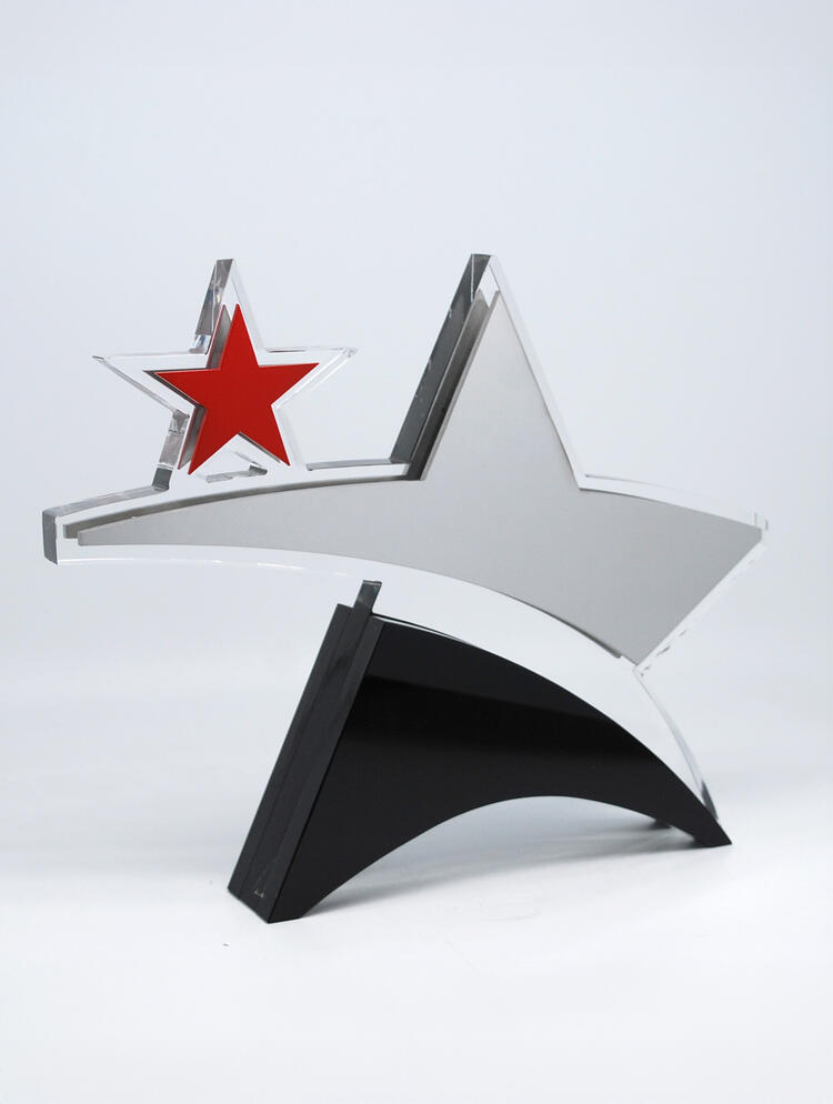 This contemporary award blends polished metal and clear acrylic to form a dynamic, star inspired design.