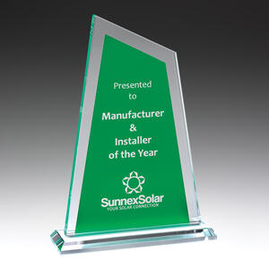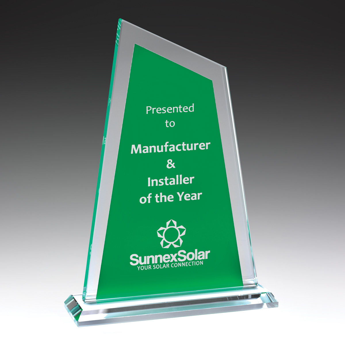 Glass trophies typically have a very slight green tinge, which can subtly affect the appearance of colour printing. In contrast, crystal trophies are completely clear.