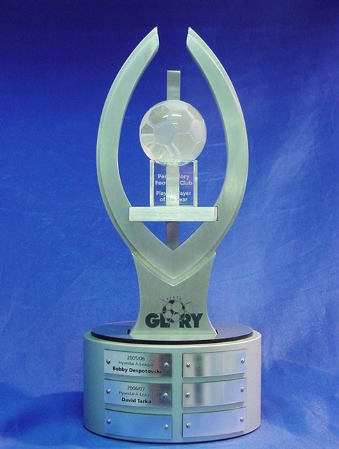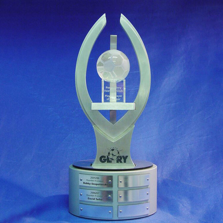 The centrepiece includes a crystal football accent supported by dual brushed metal arms, creating a striking mix of strength and refinement.