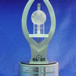 A bold, custom metal perpetual trophy featuring a polished alloy frame and circular base.
