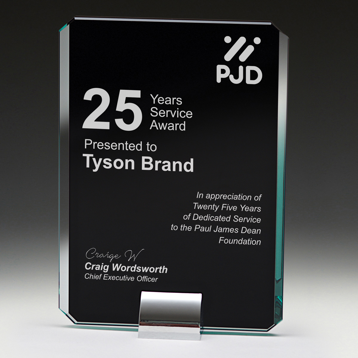 Glass trophies typically have a very slight green tinge, which can subtly affect the appearance of colour printing. In contrast, crystal trophies are completely clear.