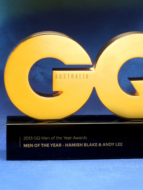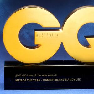 A premium gold finished alloy trophy shaped into bold GQ letters, mounted on a high gloss black base.