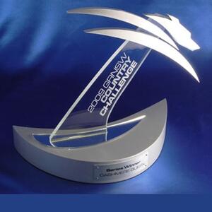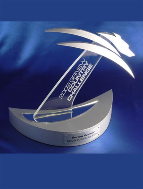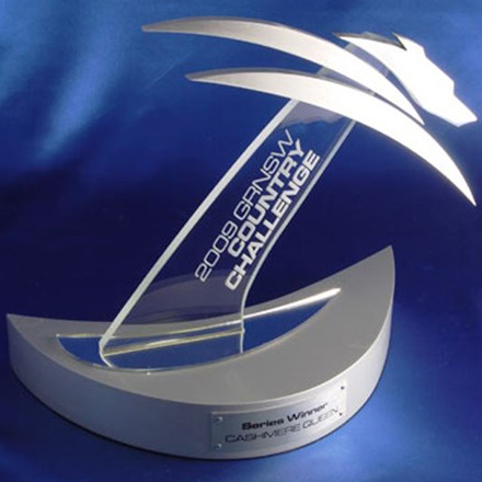 A sleek metal and acrylic award featuring a dynamic stylised greyhound silhouette and angled sail shaped base.