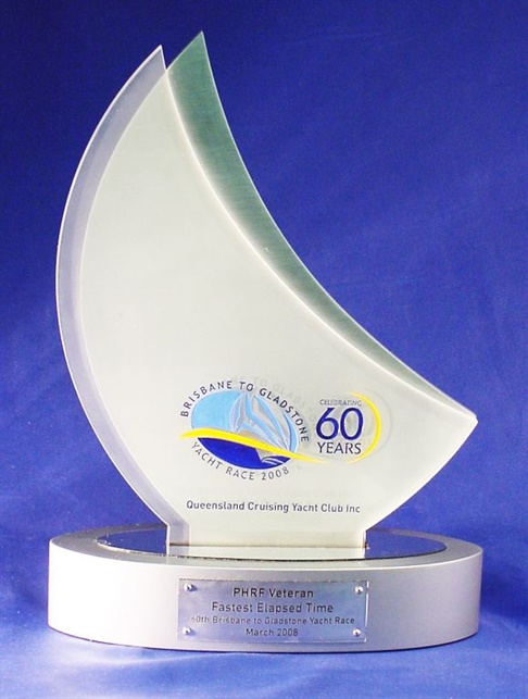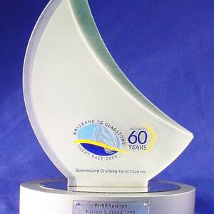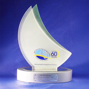 Crystal sail design layered over metal with a custom engraved plaque on a timber base.