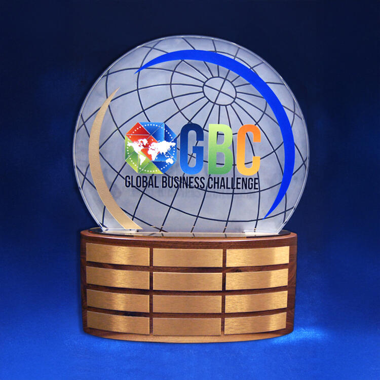 A stunning perpetual trophy featuring a crystal face etched with a detailed globe pattern and full colour printed logo. Mounted on a polished timber base with perpetual name plates.