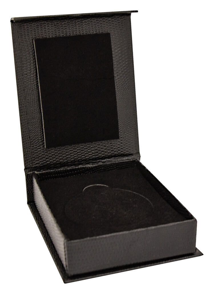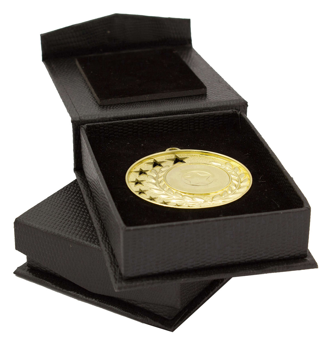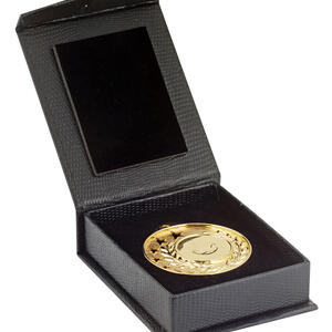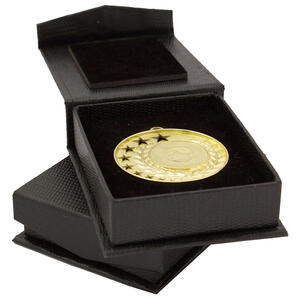 This medal presentation box combines classic black synthetic material with refined gold accents for a distinguished look. Inside your medal rests securely. Ideal for formal ceremonies or commemorations, this durable presentation box offers a memorable and professional way to celebrate success. Fits 52mm Medal
