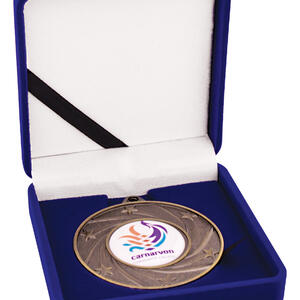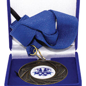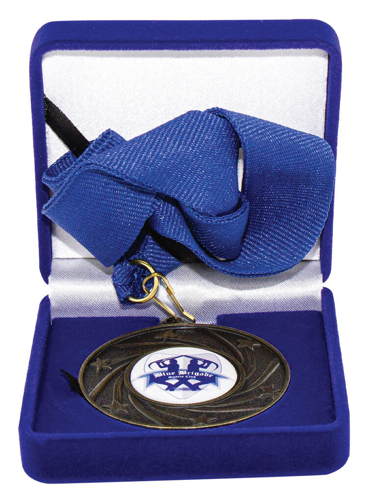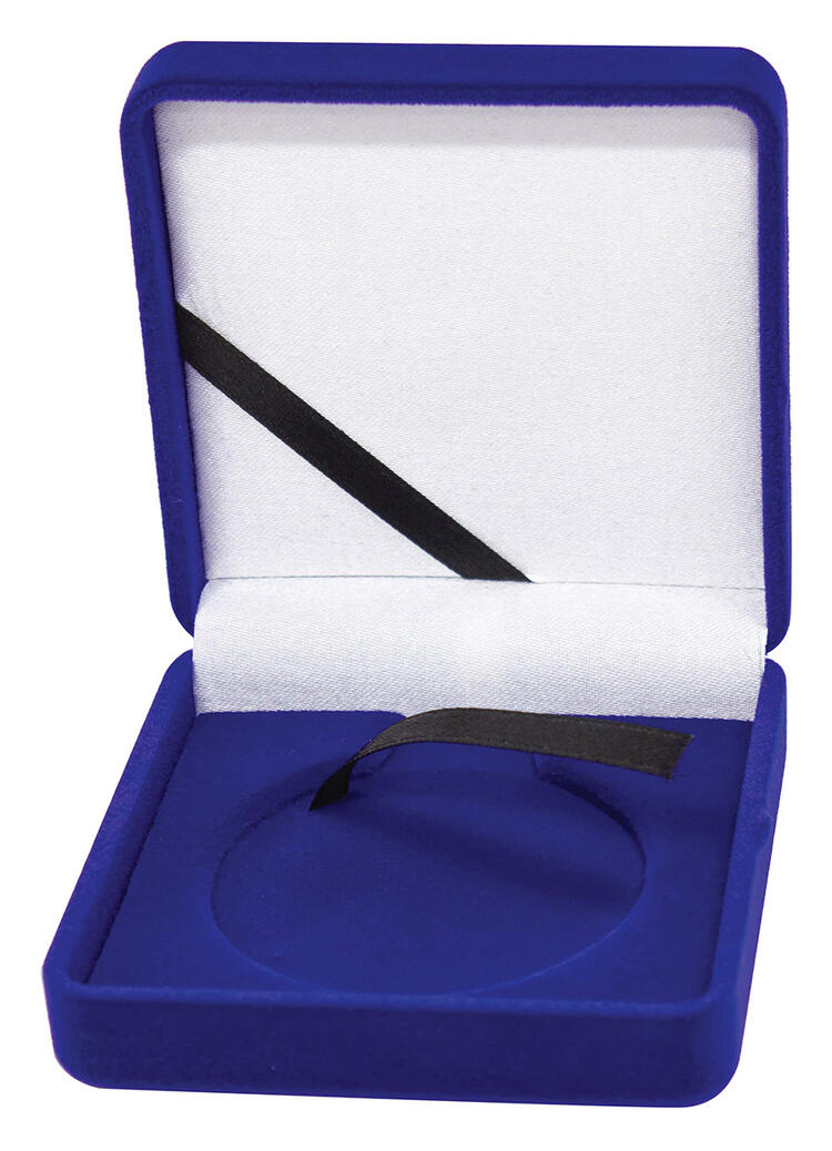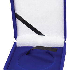 This medal presentation box offers a refined way to celebrate achievement in any sporting context. Crafted from deep blue velvet, the rectangular case protects and displays a circular metal medal, all set against a plush, velvet lined interior, creating a memorable and professional presentation. Fits 50mm Medal