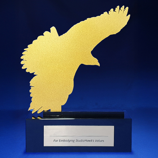 The Golden Hawk Custom Award showcases the striking silhouette of a soaring hawk, precision cut from durable gold alloy and finished with a texured surface. Mounted on a polished black crystal base, this bold and elegant piece captures both motion and prestige.