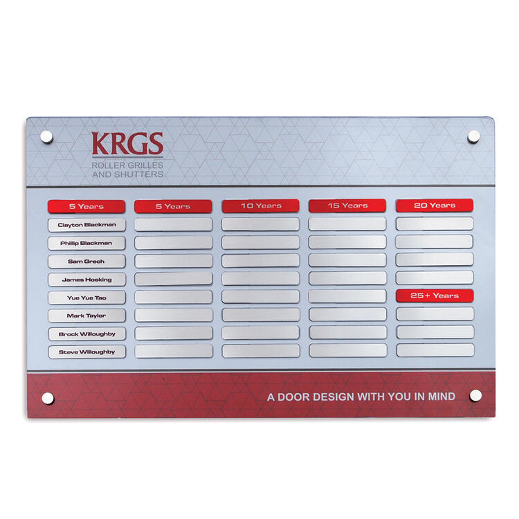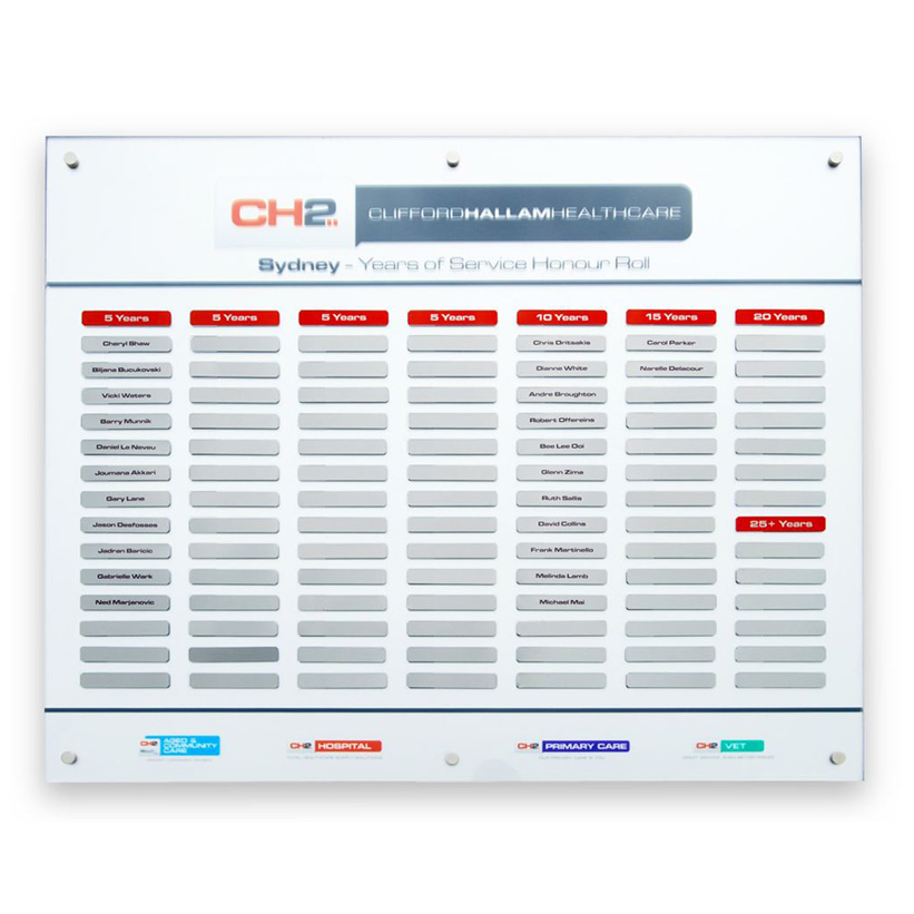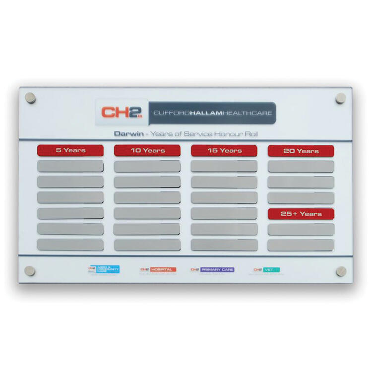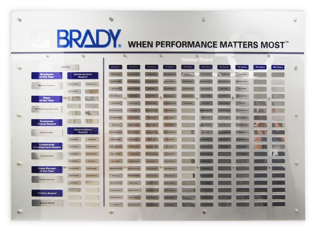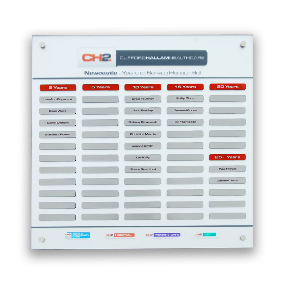 Our contemporary honour boards are made from acrylic, metal, glass, or a combination.
