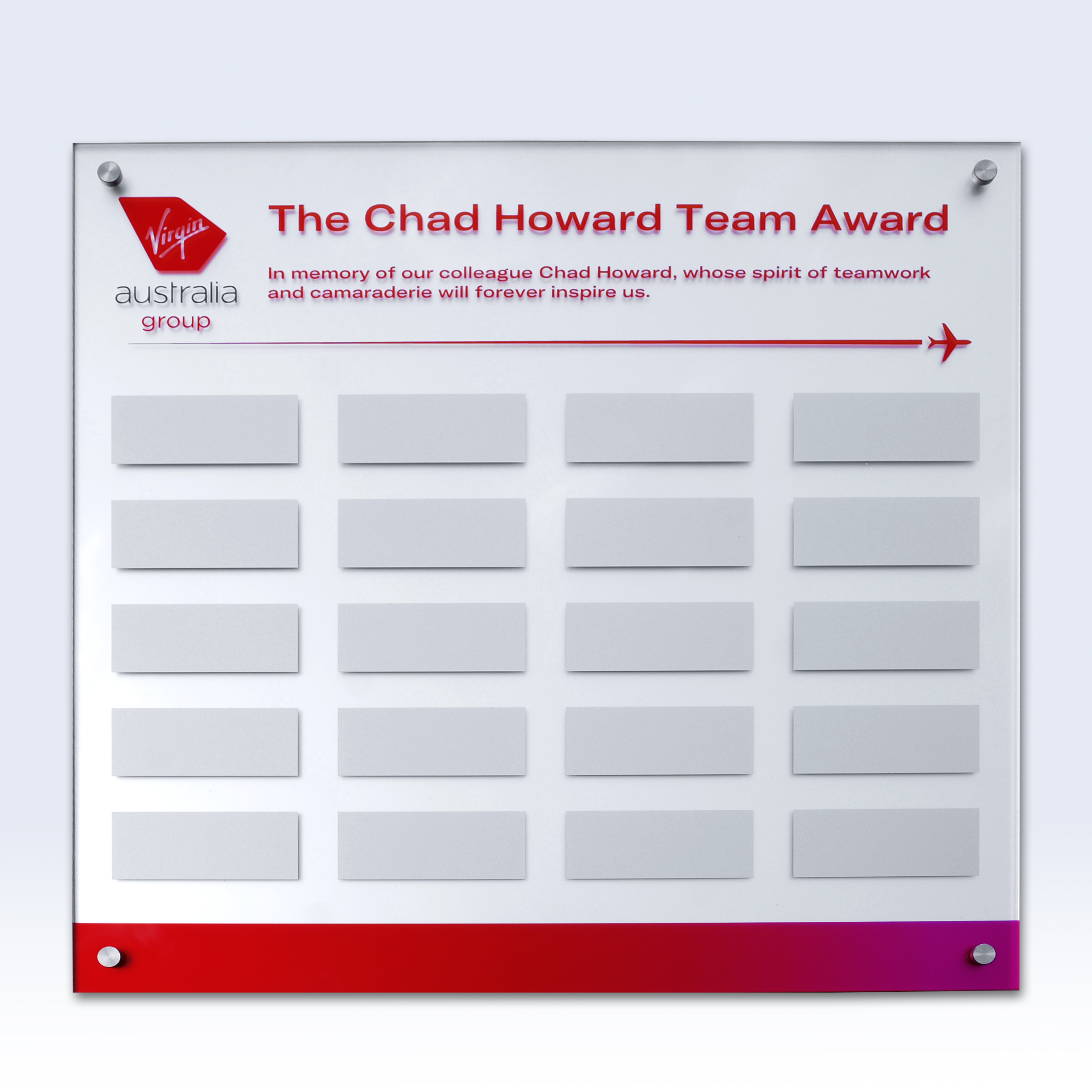 Our contemporary honour boards are made from acrylic, metal, glass, or a combination.