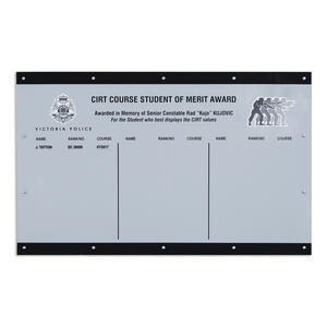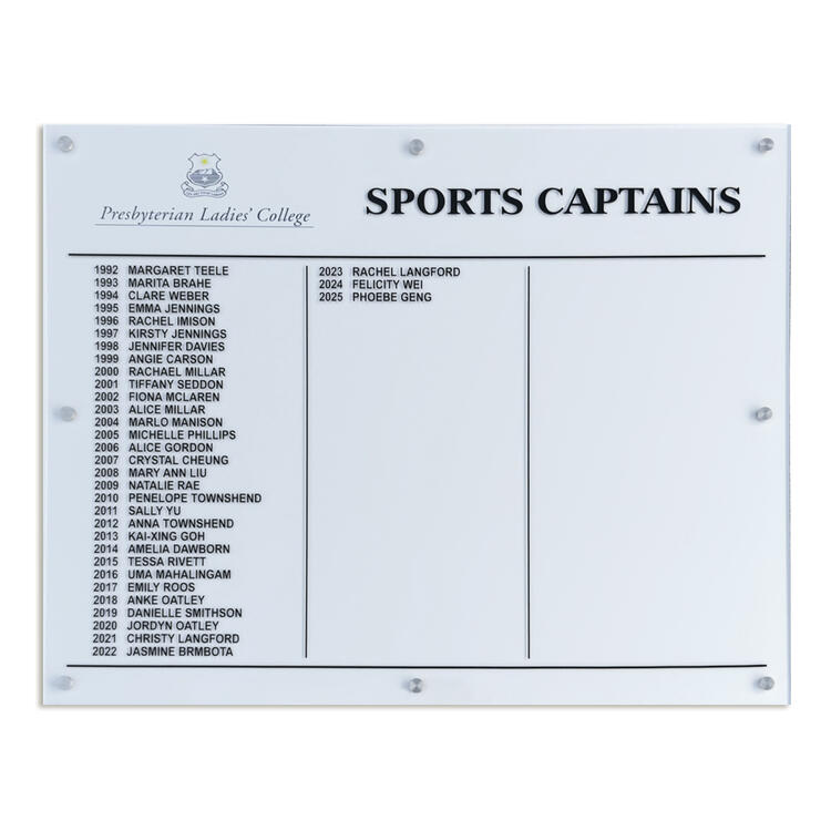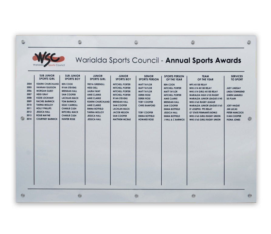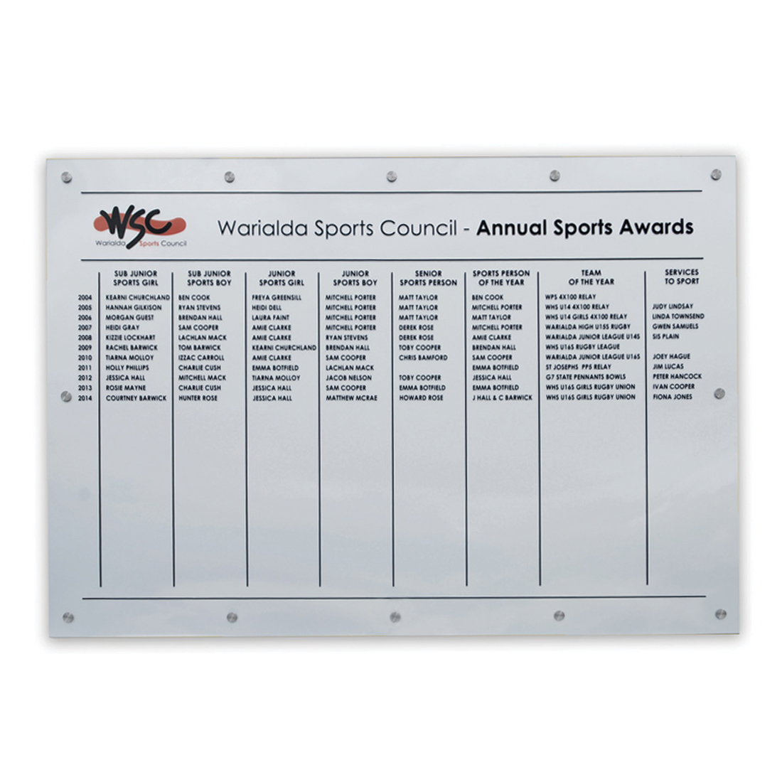 Our contemporary honour boards are made from acrylic, metal, glass, or a combination.