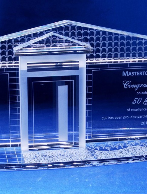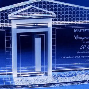 A stunning house shaped crystal award with detailed engraving capturing architectural precision.