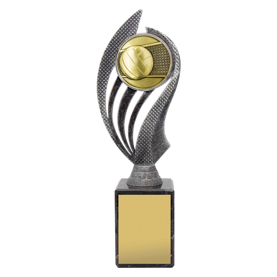 This modern volleyball trophy displays a detailed ball and net motif set within a sweeping silver and gold design. Crafted from durable resin, itÂ’s a dynamic choice for team awards, MVPs and tournament winners. Includes space for engraving.