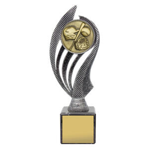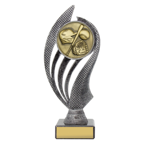 A dynamic resin baseball and softball trophy with curved arms supporting a gold medallion featuring bat, glove, ball, and helmet design. The textured silver and gold finish gives this trophy a contemporary feel, ideal for any competition or season award.