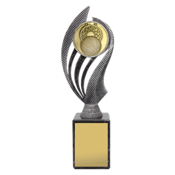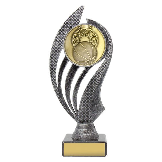 A striking flame style design symbolising energy and success, this basketball trophy features a gold medallion set in a textured silver resin body with marble base. Perfect for recognising standout effort and teamwork. Supplied with an engraving plate for personalisation.